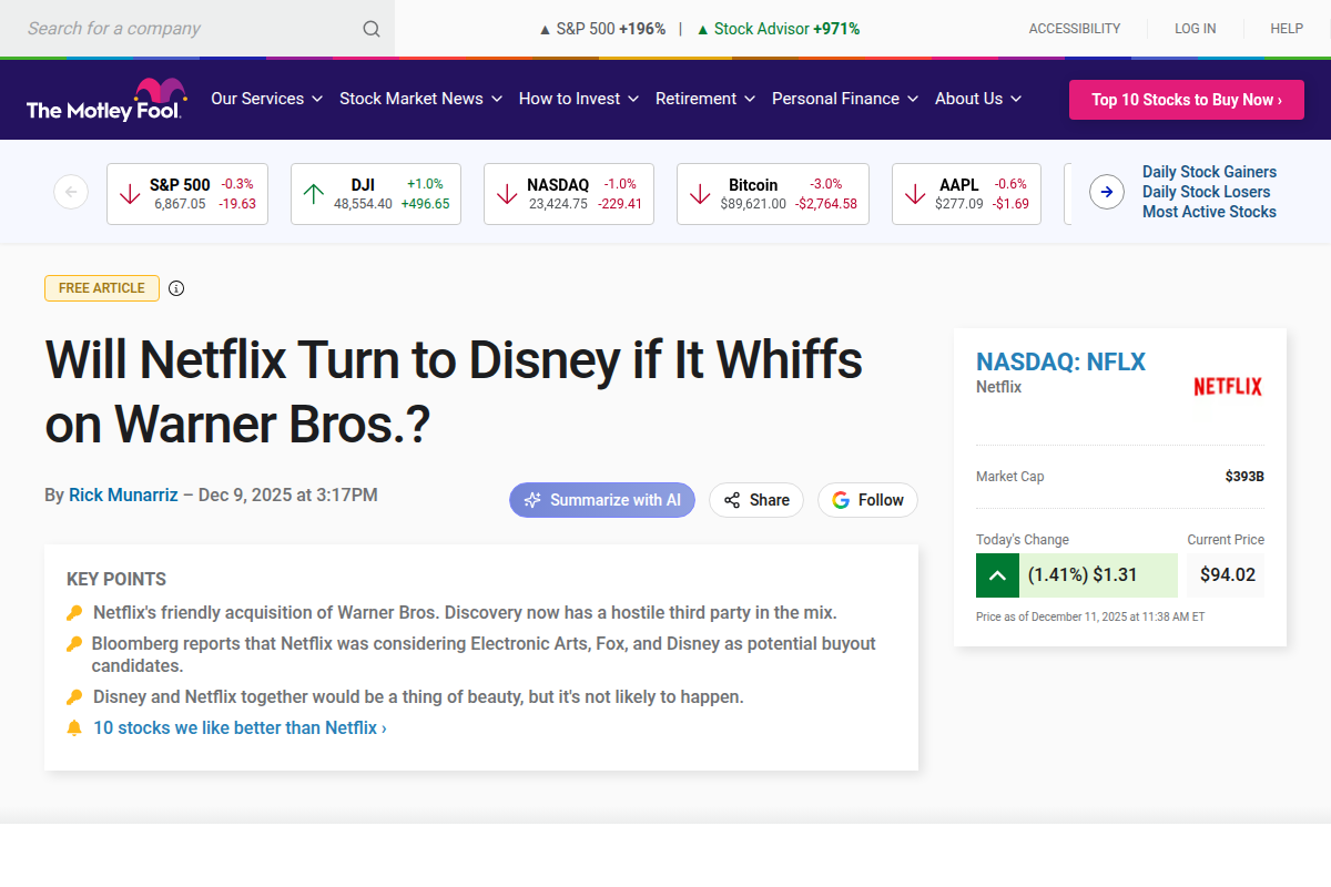 A recent report from The Motley Fool captured attention after it addressed speculation about Netflix’s next moves. The report said Netflix considered Disney before approaching Warner Bros. Discovery about a possible content deal. Sources familiar with the matter did not expect Netflix to switch to Disney if talks with Warner Bros. Discovery broke down.