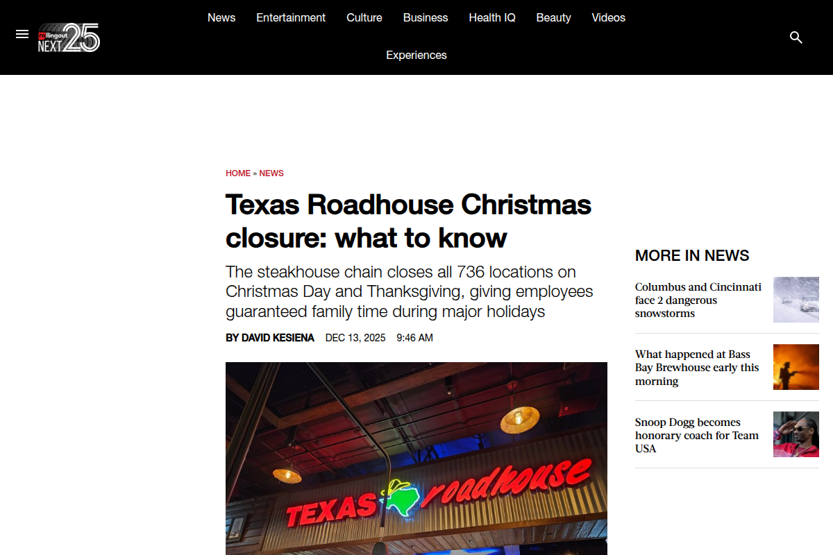 The closure will begin at the end of business on Christmas Eve, and all locations are set to reopen the next day. According to company information and local store announcements, last seating on December 24 will vary by location. Some Texas Roadhouse locations plan to close early, such as a restaurant in Sherman, Texas, which posted holiday hours of 11:00 am to 8:00 pm on Christmas Eve.